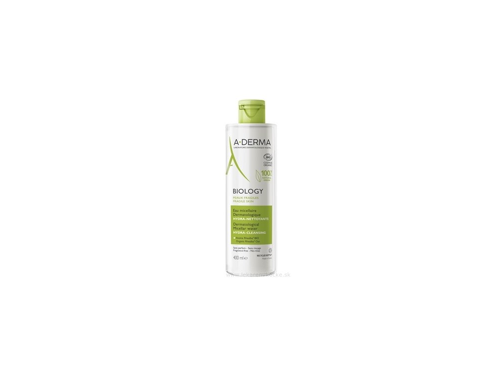 Společnost A-Derma vyvinula Dermatologickou hydratační micelární vodu BIOLOGY, aby odstraňovala make-up a zároveň účinně a velmi šetrně čistila křehkou pleť obličeje. Tato 100% přírodní a zároveň BIO čistící micelární voda s optimální snášenlivostí spojuje dermatologické potřeby a účinnost ve svěží, nelepivé textuře. Jeho složení, které obsahuje klíčovou aktivní látku řady BIOLOGY, BIO extrakt z ovsa Rhealba®, čistí a odstraňuje nečistoty z pleti, jemně odstraňuje make-up bez vysušování pleti, hydratuje ji a obnovuje její rovnováhu. Dermatologická hydratační čistící micelární voda bez oplachování, testovaná na alergické pleti, je bez parfemace a lze ji používat na obličej a oční okolí. Pleť je dokonale vyčištěná a vyvážená.