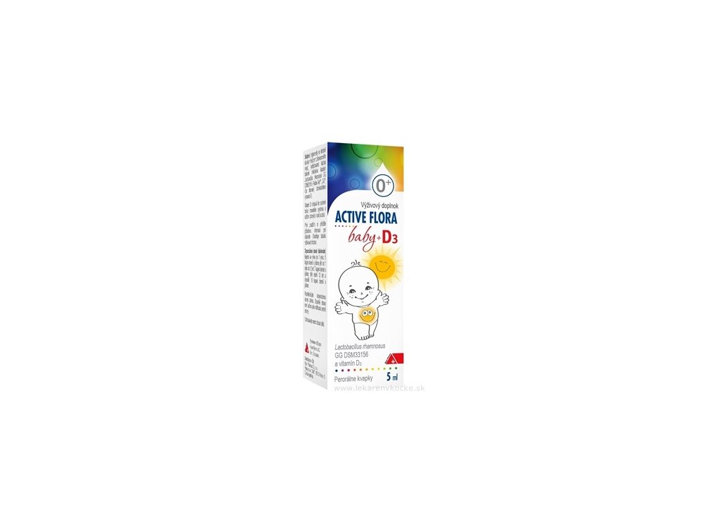 Active Flora Baby +D3 je výživový doplněk určený pro novorozence, kojence, děti i dospělé, který kombinuje probiotika s vitamínem D3. Tento produkt podporuje zdravou střevní mikroflóru, zlepšuje trávení a zároveň přispívá ke správnému fungování imunitního systému. Obsahuje známý a klinicky ověřený probiotický kmen Lactobacillus rhamnosus GG (LGG®) a denní dávku vitamínu D3, nezbytného pro zdravý růst a vývoj kostí u dětí.