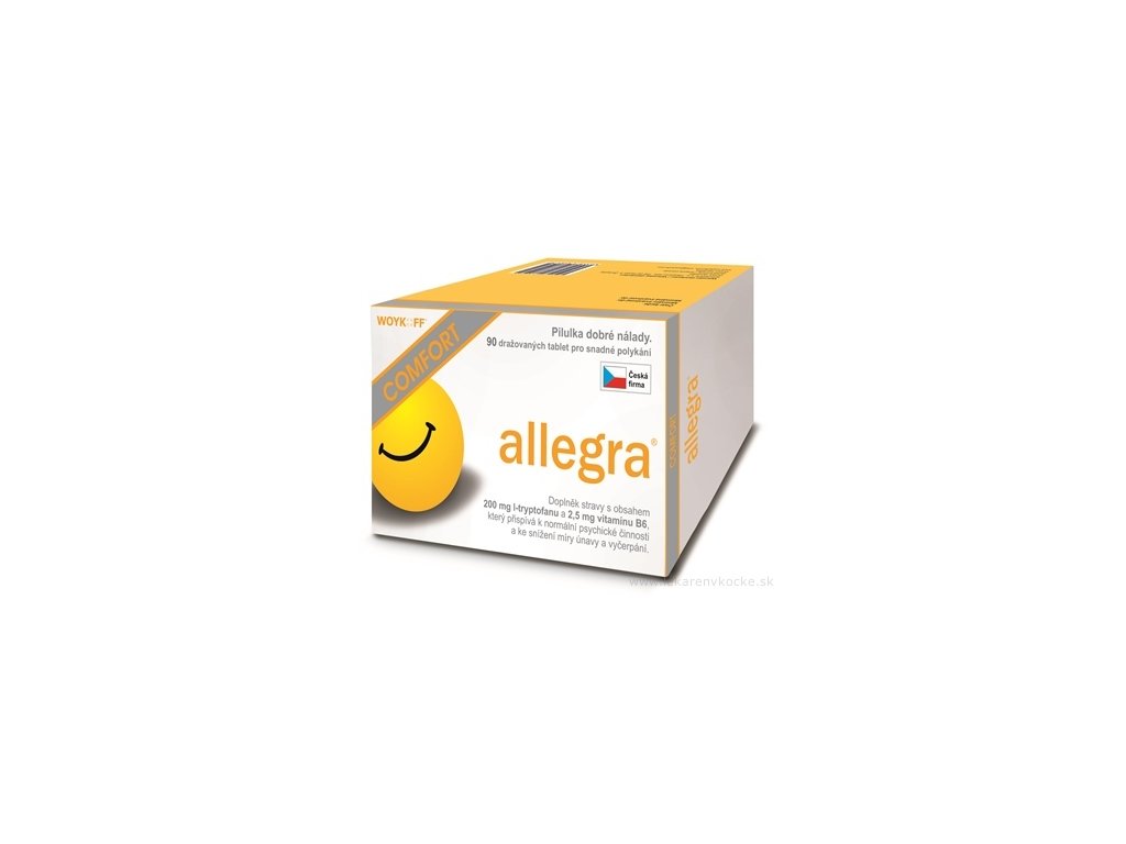 allegra COMFORT je výživový doplněk s obsahem unikátní kombinace esenciální aminokyseliny l-tryptofan, která je jediným prekurzorem neurohormonů dobré nálady serotoninu, melatoninu a vitamínu B6, který přispívá k normální psychické činnosti, snížení míry stresu, únavy a vy neuronech. Přípravek také obsahuje malé množství sacharózy (166 mg v jedné tabletě), která přispívá k výrazně rychlejšímu transportu l-tryptofanu přes hematoencefalickou bariéru a tím k zesílení účinku a rychlejšímu nástupu účinku.