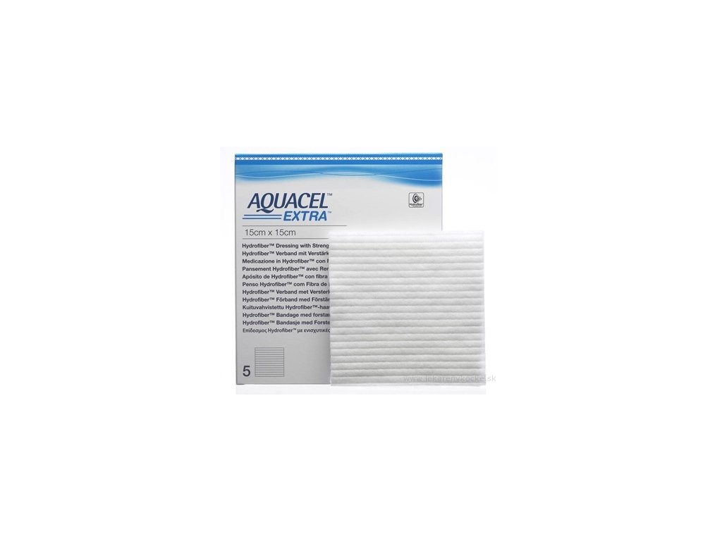 AQUACEL® EXTRA™ vysokoabsorbční krytí se zpevněným vláknem. 1 balení obsahuje 5 ks sterilních krytí, velikost 15x15cm. Krytí je indikováno jako primární krytí pro management bércových vředů, proleženin (II.-IV. stupně), diabetických vředů, chirurgických ran (např. pooperační rány, sekundárně se hojící rány a místa po odběru kožního štěpu), povrchových popálenin, traumatických ran (např. přečnívající kožní tumory, kožní metastázy, Kaposiho sarkom). Krytí: