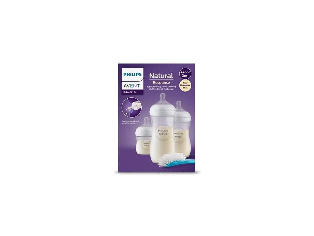 Novorozenecká startovací sada obsahuje láhve Natural Response s dudlíky na podporu rytmu pití dítěte podobně jako s prsu.
