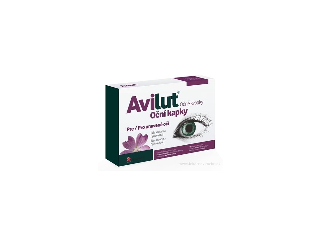 Oční kapky AVILUT® jsou s lubrikačním, zvlhčujícím účinkem na bázi destilované vody s výtažkem ze slézu as kyselinou hyaluronovou v praktickém sterilním balení po jednotlivých dávkách.