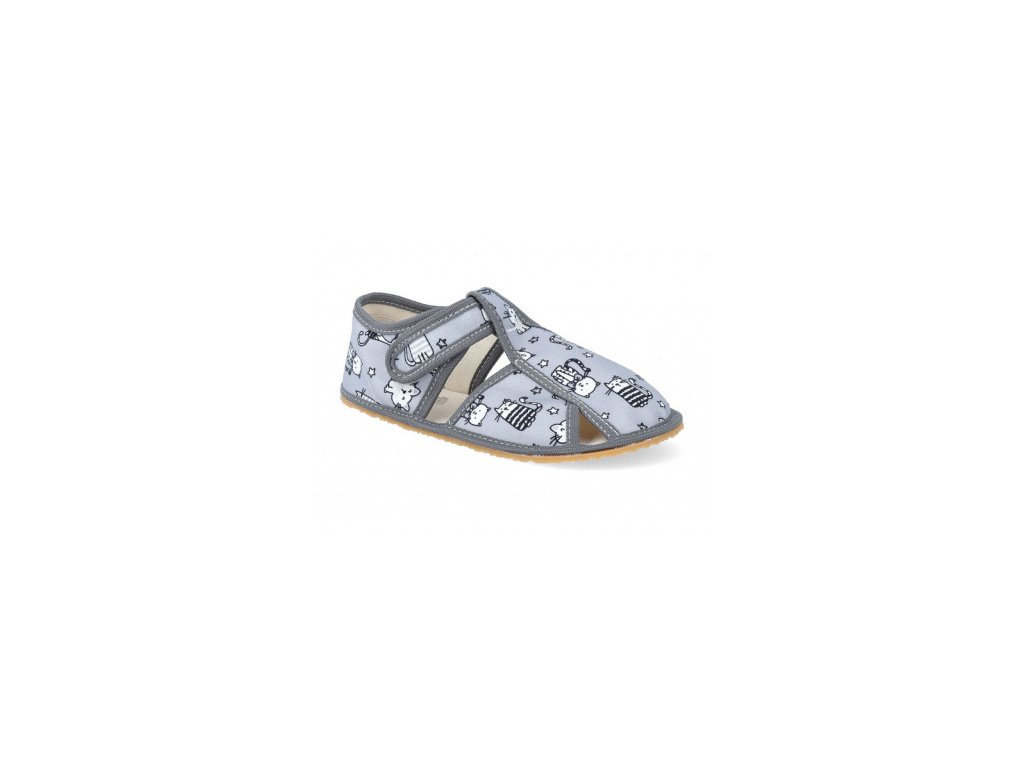 Baby Bare Slippers Nr. 21 – Šedé bavlněné barefoot bačkůrky s kočkou, grey cat