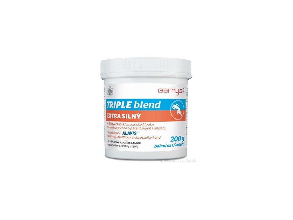 TRIPLE blend extra silný s aroma a se sladidlem - obsahuje kombinaci chondroprotektivních látek - glukosamin a chondroitin sulfátu, látku MSM a značkové rybí kolageny. Chondroprotektivní látky spolu s kolagenem II. typu přirozeně tvoří strukturu kloubní chrupavky, zatímco kolagen I. typu je součástí vaziva a MSM (methylsulfonylmethan) je zdrojem organicky vázané síry. Navíc tento produkt je obohacen o vitamín C (NUTRA-CTM), který je důležitý pro normální tvorbu kolagenu a přirozenou funkci chrupavky a kostí. NUTRA-CTM- Unikátní forma vitamínu C. Díky obsahu chelátových minerálů a úplné ionizaci je NUTRA-CTM téměř 100% biologicky dostupné již od okamžiku příjmu do organismu. Naproti klasickému vitamínu C rozpustnému ve vodě se snižuje rychlá ztráta močí.