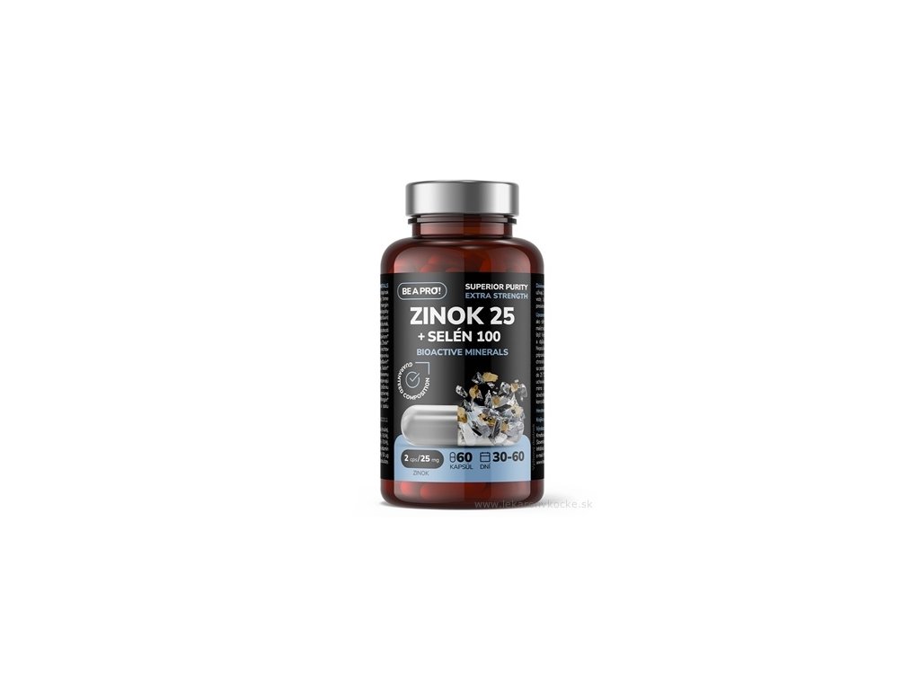BE A PRO! Zinek 25+ Selen 100 Bioactive Minerals je prémiový minerálně-vitamínový doplněk s maximální vstřebatelností. Obsahuje chelátový zinek, organický selen, mangan a vitamíny B2 a B6 pro imunitu, vitalitu, zdravou pokožku, vlasy a nehty, v nejčistší formě ověřené laboratoří.