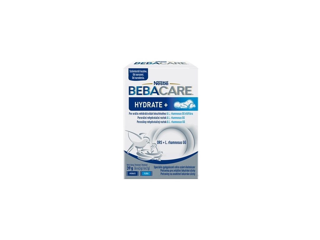 BEBACARE® HYDRATE+ je perorální rehydratační roztok s bakteriemi mléčného kvašení L. rhamnosus GG. Potraviny pro zvláštní lékařské účely. 39 g (6 x 4,5 g / 6 x 2 g)