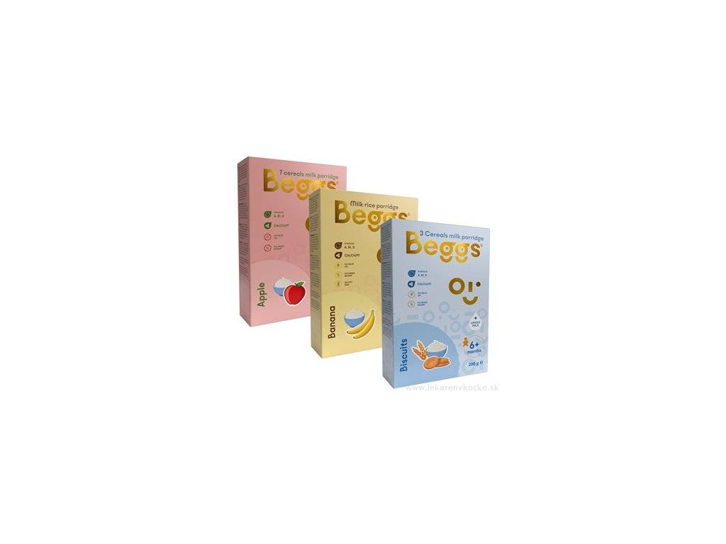 Složení Beggs Mléčné 7-zrnné kaše jablečné (200 g): 7 druhů obilovin (42 %) (OVSENÁ celozrnná mouka, PŠENIČNÍ celozrnná mouka, ŽITNÁ celozrnná mouka, JEČMENNÁ celozrnná mouka kukuřičná mouka, rýžová mouka), sušené plnotučné MLÉKO (27 %), maltodextrin, jablečné vločky (7 %) [jablko (69 %), rýžová mouka], uhličitan vápenatý, přírodní aroma, thiamin-hydrochlor cholekalciferol (vitamin D). Obsahuje GLUTEN. Alergeny jsou vyznačeny VELKÝMI PÍSMENY. Složení se vztahuje k sušenému stavu potraviny.