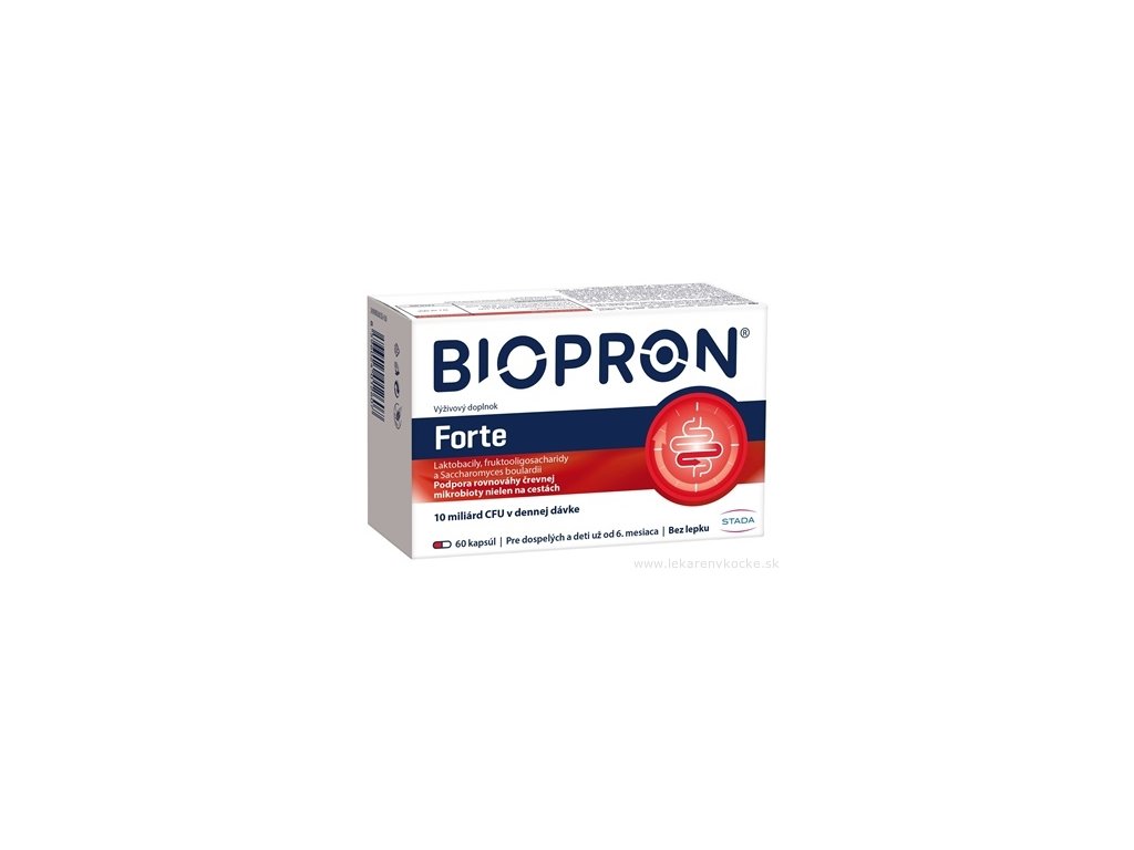 Doplněk stravy Biopron® FORTE obsahuje jedinečnou kombinaci bakterií (Lactobacillus helveticus, Lactobacillus rhamnosus) a kvasinek (Saccharomyces boulardii) a fruktooligosacharidy. Obsahuje 10 miliard CFU (živých mikroorganismů) v denní dávce (ve 2 kapslích).
