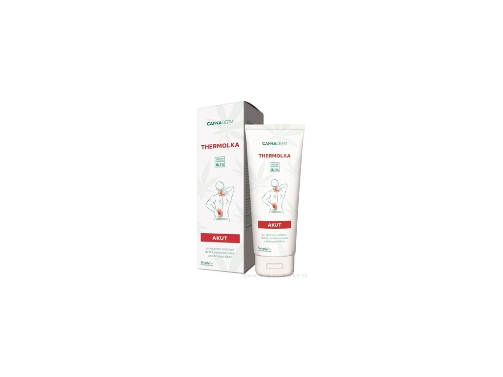 Cannaderm Thermolka AKUT je hřejivá masážní emulze pro intenzivní úlevu při akutním přetížení zad, natažení svalů a ztuhlosti kloubů. Unikátní komplex účinných látek CANNAKUT přináší hluboký pocit úlevy zad, svalům i kloubům a rychlejší efekt v ošetřených oblastech. Obsažený extrakt z pálivých papriček zajišťuje příjemné dlouhotrvající zahřátí ztuhlých zad či kloubů a špatně prokrvovaných studených končetin. Opakovaná aplikace Thermolky AKUT navíc přináší další zintenzivnění účinku a pocit úlevy i v extrémních či přetrvávajících stavech. Cannaderm Thermolka AKUT je emulze určená k aplikaci na kůži v oblasti zad, svalů a kloubů za účelem její ochrany, zahřátí a zlepšení stavu.