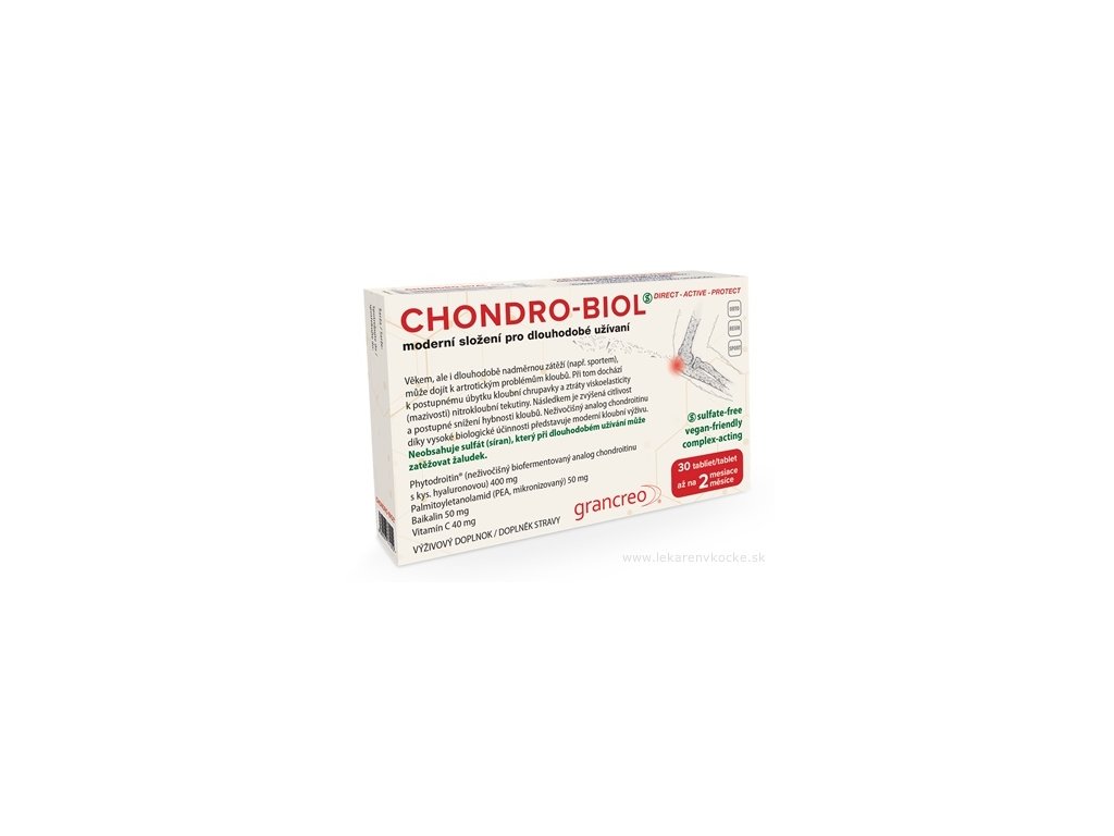CHONDRO-BIOL je unikátní výjimkou mezi produkty s obsahem chondroitinu sulfátu. Obsahuje totiž neživočišný biologicky fermentovaný chondroitin, který „produkují“ speciální bakterie. Tato moderní vědecká výroba vede k produkci chondroitinu s více než 90% podobností s chondroitinem, který mají lidé v kloubech. Díky tomu má až do 65krát vyšší biologickou dostupnost (propustnost) v porovnání s běžným živočišným chondroitinem v tradičních produktech. Tím je zajištěna i relativně vysoká afinita k lidské chrupavce a meništěm a tedy reálná biologická využitelnost. Další nespornou výhodou neživočišného biologicky fermentovaného chondroitinu je, že i 48 hodin po užití se v krvi ještě nachází poměrně dostatečné množství, které je biologicky využitelné pro výživu chrupavky. Proto se doporučená denní dávka produktu CHONDRO-BIOL je pouze 1 tableta každý druhý den, což může přispět k lepší snášenlivosti zejména u starších lidí. CHONDRO-BIOL obsahuje 30 tablet, což při doporučeném dávkování vystačí až do 2 měsíců a je běžně dostupný v lékárně.