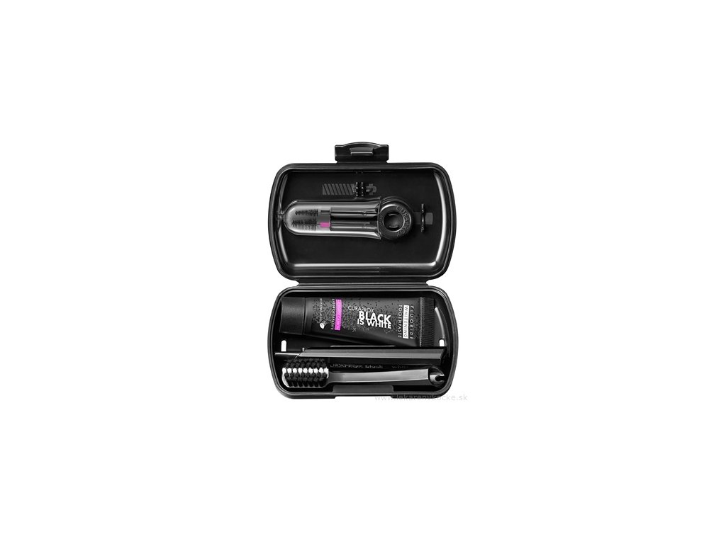 Cestovní sada pro dentální hygienu ve verzi Black Is White v praktické plastové krabičce o rozměrech 9,5 x 6 cm obsahuje: