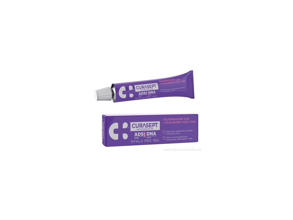 CURASEPT ADS DNA HYALU PRO – parodontální gel s 0,5% chlorhexidinem a kyselinou hyaluronovou, který vytváří ochranný film na dásních a podporuje regeneraci tkání po zubních zákrocích.