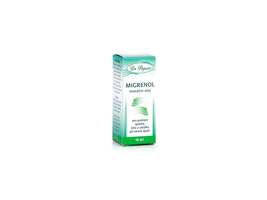 Migrenol je vhodný k potírání spánků, čela a zátylku při únavě, migréně, cestovní nevolnosti a bolestech hlavy. Obsažené přírodní silice, mentol a kafr odstraňují únavu a uvolňují stres. Upozornění - neužívat při zvýšené citlivosti pleti.
