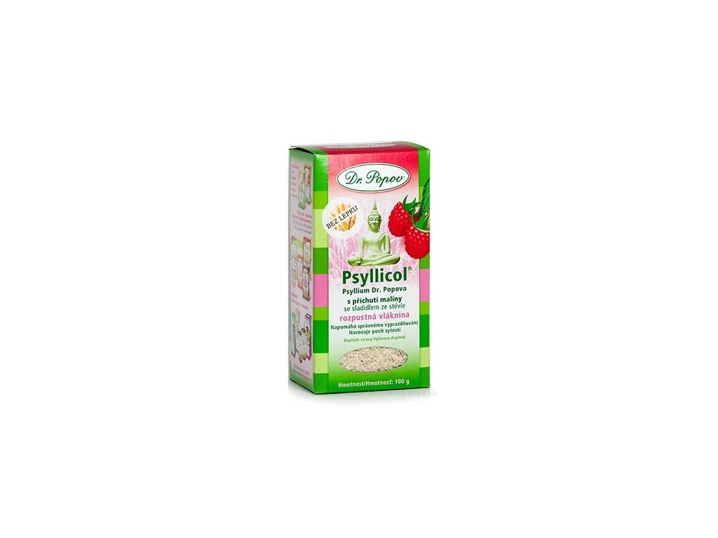 Doplněk stravy. Psyllicol® Psyllium Dr. Popova s příchutí maliny. Vynikající rozpustná vláknina s ovocnou chutí. Obsahuje vysoce kvalitní Psyllium Dr. Popova, která zvyšuje denní spotřebu vlákniny, v kombinaci s ochucující složkou.