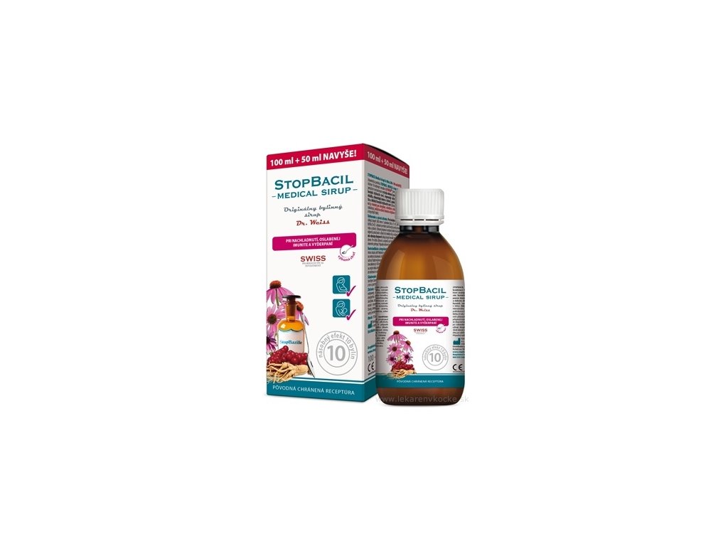 STOPBACIL Medical sirup Dr. Weiss – zdravotnická pomůcka, obsahuje unikátní účinné složení 10 rostlinných extraktů ALPINIUMTM, které několika vzájemně se podporujícími mechanismy zvyšují odolnost proti opakovaným infekcím horních cest dýchacích, regenerují vyčerpanou imunitu, posilují vitalitu, omezují únavu a slabost, uklidňují (dušnost, kašel, bolest v krku). Přípravek je vhodný pro alergiky, celiatiky a diabetiky (slazený fruktózou a sukralózou), mohou jej užívat těhotné a kojící ženy (obsahuje výběr šetrných a bezpečných bylin). Pro dosažení intenzivního účinku užívají dospělí 3krát denně 1 polévkovou lžíci (15 ml), děti 4krát denně 1 čajovou lžičku (5 ml). S užíváním je vhodné začít ihned při prvních příznacích únavy, nachlazení a slabosti. Užívání přispívá k normální funkci imunitního systému, proto se doporučuje pokračovat v užívání také několik dní po ustoupení obtíží. Pro posílení obranyschopnosti užívají dospělí stejné množství 1krát denně, děti 2krát denně. Pro vyšší účinnost se doporučuje půl hodiny před užitím nejíst a nepít. Před otevřením protřepat. Případný sediment je přirozenou vlastností produktu.