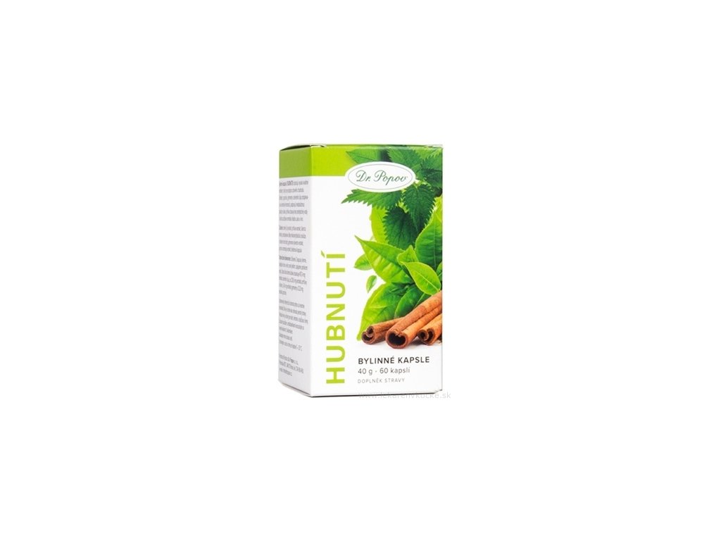 Dr. Popov Bylinné kapsle HUBNUTÍ (60 kapslí) jsou výživovým doplňkem vytvořeným pro podporu zdravého hubnutí a udržování optimální tělesné hmotnosti. Tento ověřený produkt obsahuje výběr vysoce kvalitních bylinných extraktů – zelený čaj, garcinia cambogia, gymnema sylvestre, kopřiva a skořice – které společně příznivě ovlivňují metabolismus tuků, glukózy a pomáhají redukovat nadbytečnou vodu v těle. Přípravek je certifikován jako doplněk stravy, registrovaný pod čj. VD 11.03.2025 a nevyžaduje lékařský předpis.