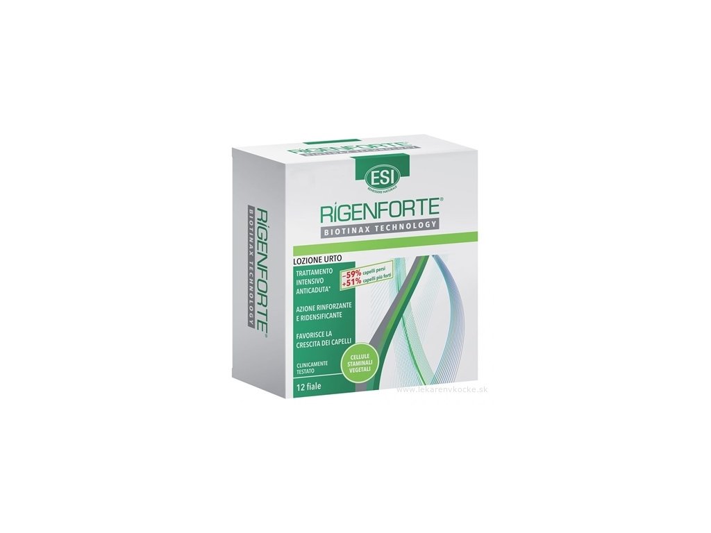 Esi Rigenforte ampule na podporu růstu a proti vypadávání vlasů. Pravidelným používáním se vlasy stávají silnější, hustší a zdravější. Je vhodný pro muže i ženy, které trápí vypadávání vlasů. Klinické testování prokázalo snížení ztráty vlasů o -59%, podrážděnost a deskvamace pokožky poklesla o -85% a pevnost vlasů vzrostla o 51% při 12 týdenním používání jedné ampule denně.