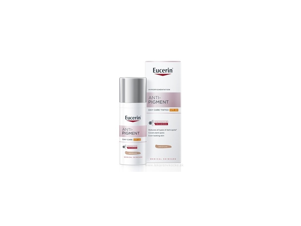 Eucerin Anti-Pigment Denní krém SPF 30 tónovaný středně tmavý obsahuje thiamidol, účinnou a patentovanou složku, která působí na základní příčinu hyperpigmentace snížením tvorby melaninu. Klinické a dermatologické testy prokázaly, že redukuje tmavé skvrny a brání jejich opakovanému výskytu. První výsledky jsou patrné po dvou týdnech a při pravidelném používání se dále zlepšují.