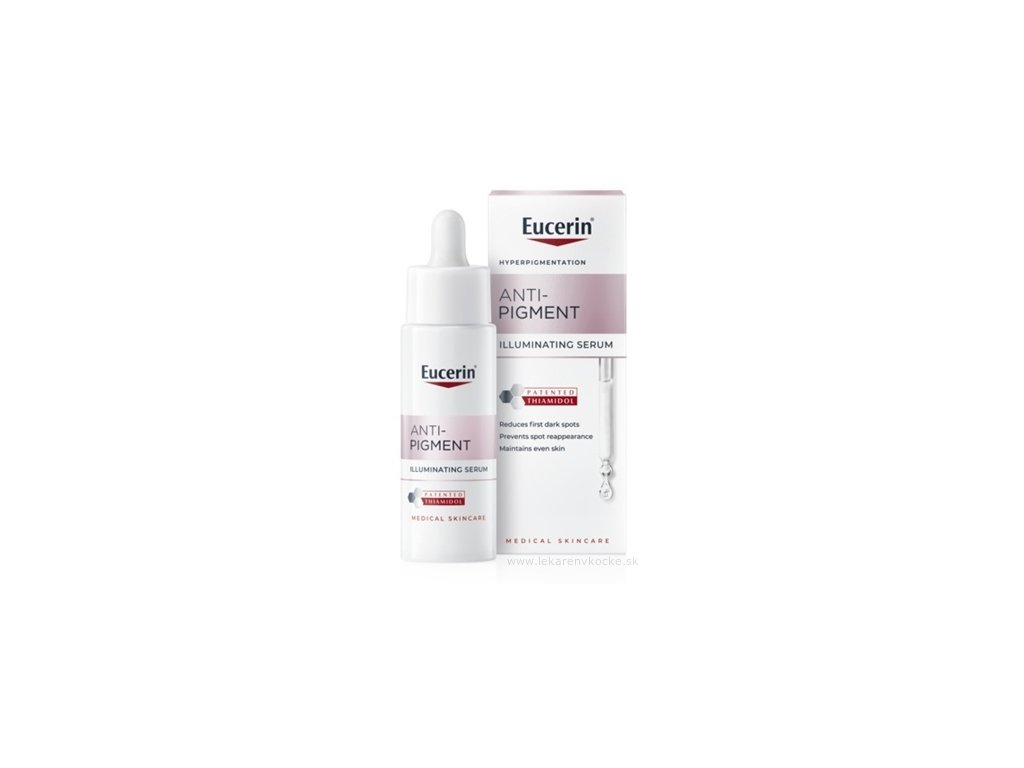 Eucerin Anti-Pigment Rozjasňující sérum i Eucerin Anti-Pigment Sérum s duálním účinkem obsahují thiamidol, který pomáhá bránit opakovanému výskytu pigmentových skvrn. Pro větší zářivost pleti vyzkoušejte Eucerin Anti-Pigment Rozjasňující sérum a pro cílenou redukci pigmentových skvrn vyzkoušejte Eucerin Anti-Pigment Sérum s duálním účinkem.