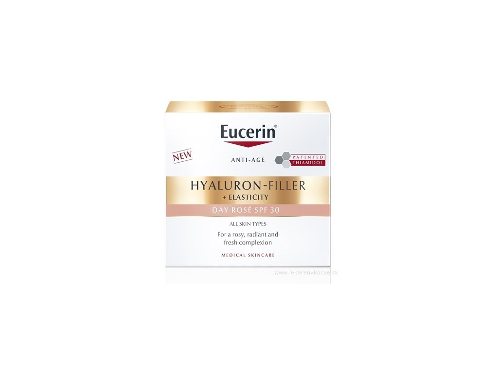 Eucerin Hyaluron-Filler + Elasticity Rosé SPF 30 je denní krém proti stárnutí, který okamžitě dodá pleti zářivý růžový nádech, vyplňuje hluboké vrásky, zlepšuje pružnost pleti, redukuje stařecké skvrny a okamžitě navrací pleti jas.