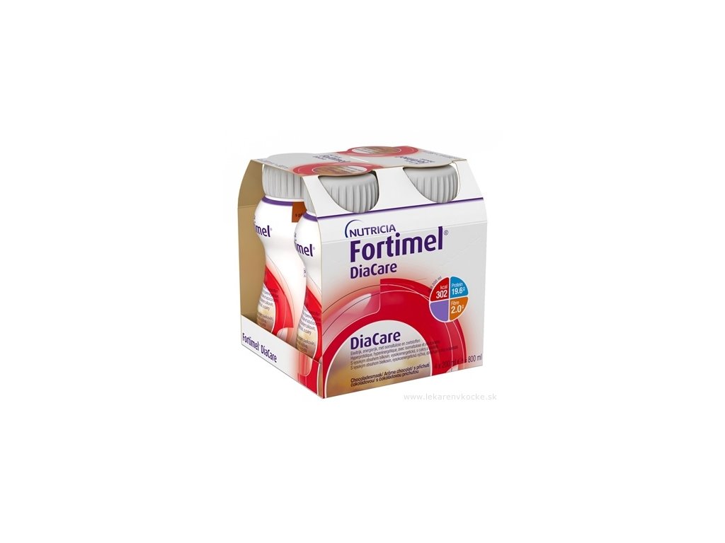 Obsahuje cukry a sladidla. Na dietní režim při podvýživě související s onemocněním u pacientů s diabetes mellitus nebo hyperglykémií. Fortimel DiaCare je vysoce energetická tekutá výživa s vysokým obsahem bílkovin. Obsahuje vlákninu. Bezlepkový. Baleno v ochranné atmosféře.