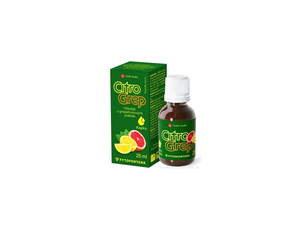 fytofontana CitroGrep kapky jsou výživový doplněk přírodního původu ve formě kapek, vyrobený z jadérek grapefruitu s BIO extraktem. Přípravek je určen k doplnění stravy v obdobích zvýšené zátěže organismu. Jadérka grapefruitu přirozeně obsahují vysoký podíl bioflavonoidů, které jsou součástí běžné rostlinné stravy.