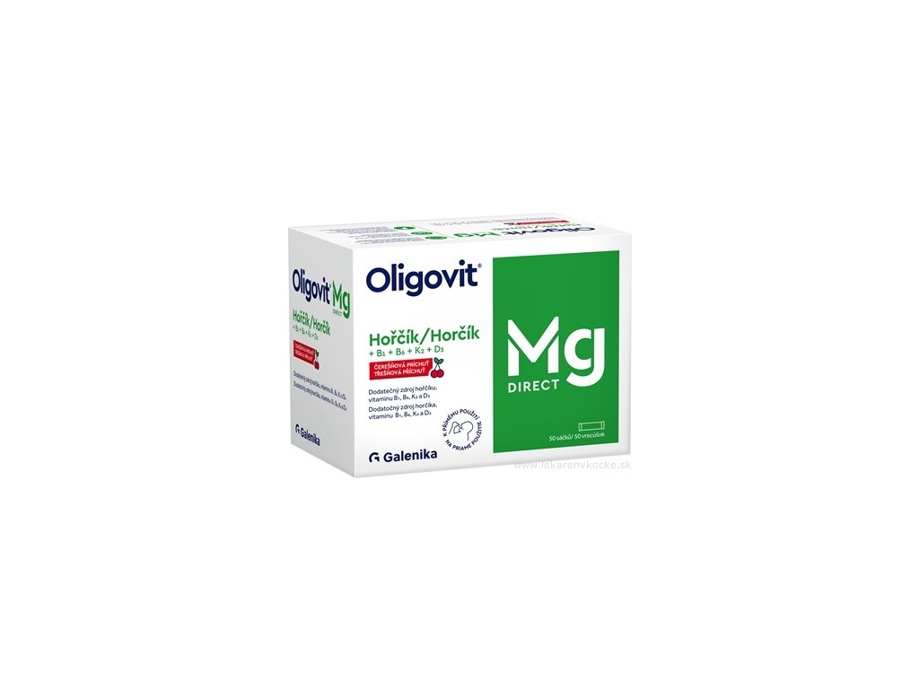 Doplněk stravy Oligovit® Mg DIRECT, prášek pro přímé perorální použití obsahuje dodatečný zdroj hořčíku, vitaminu B1, B6, K2 a D3.