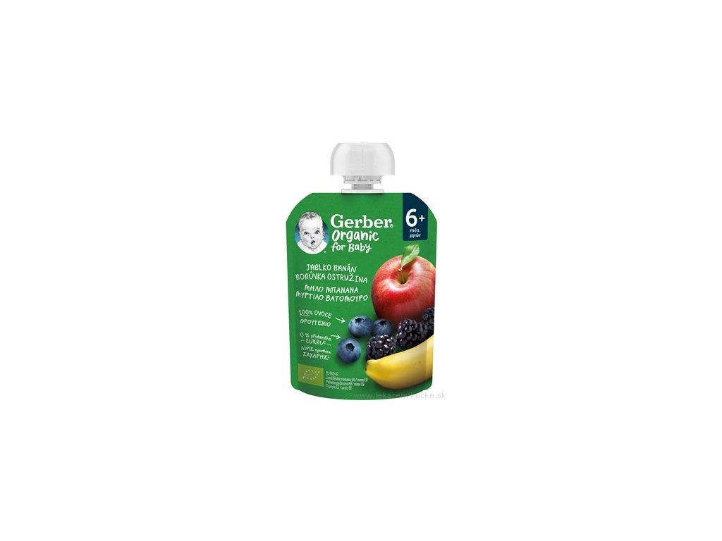 GERBER Organic kapsička jablko, banán, borůvka a ostružin je vyrobeno z nejkvalitnějšího ovoce. Kapsička obsahuje pyré ze zralých kousků jablka a banánu, borůvek, ostružin a kapku citrónové šťávy. Váš malý jedlík má tak vynikající chuť ovoce na dosah ručičky. GERBER Organic stejně jako maminka dohlíží na to, aby každá kapsa obsahovala jen to nejlepší ovoce plné skutečné chuti.
