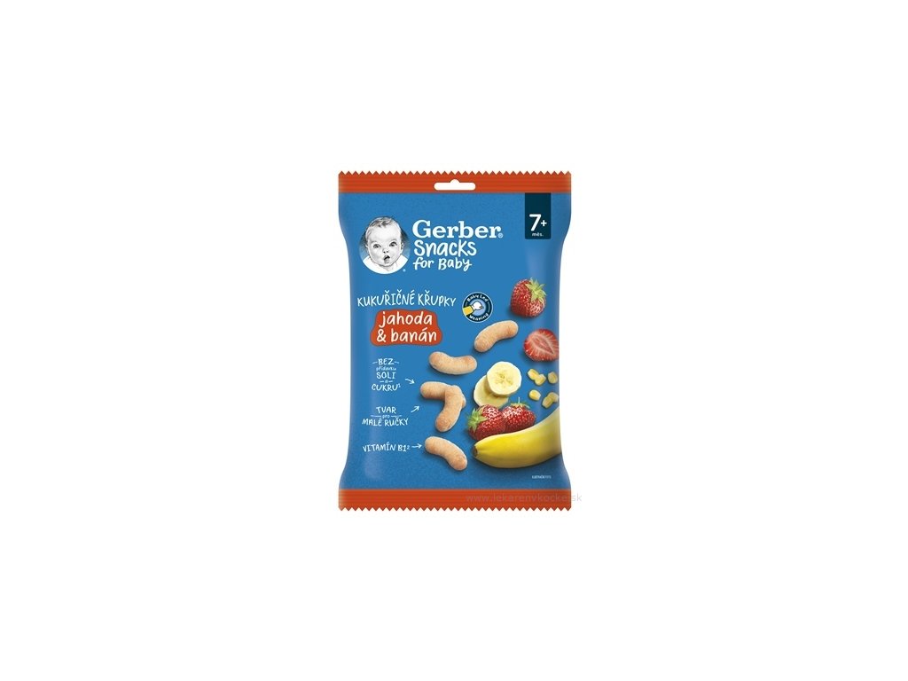 GERBER Snacks kukuřičné křupky jahoda a banán představují chutnou a praktickou svačinku, která je určena pro děti od ukončeného 7. měsíce. Křupky jsou obohaceny o vitamín B1**, který přispívá k získávání a využívání energie v důležitém období dítěte. Křupky jsou tvarem i strukturou speciálně přizpůsobeny potřebám malého dítěte pro radost ze samostatného jídla. Díky své jemné struktuře se v ústech dítěte snadno rozpouští, takže se nemusíte obávat o bezpečnost svého děťátka. Křupky slouží jako praktická svačinka nejen doma, ale i na cestách.