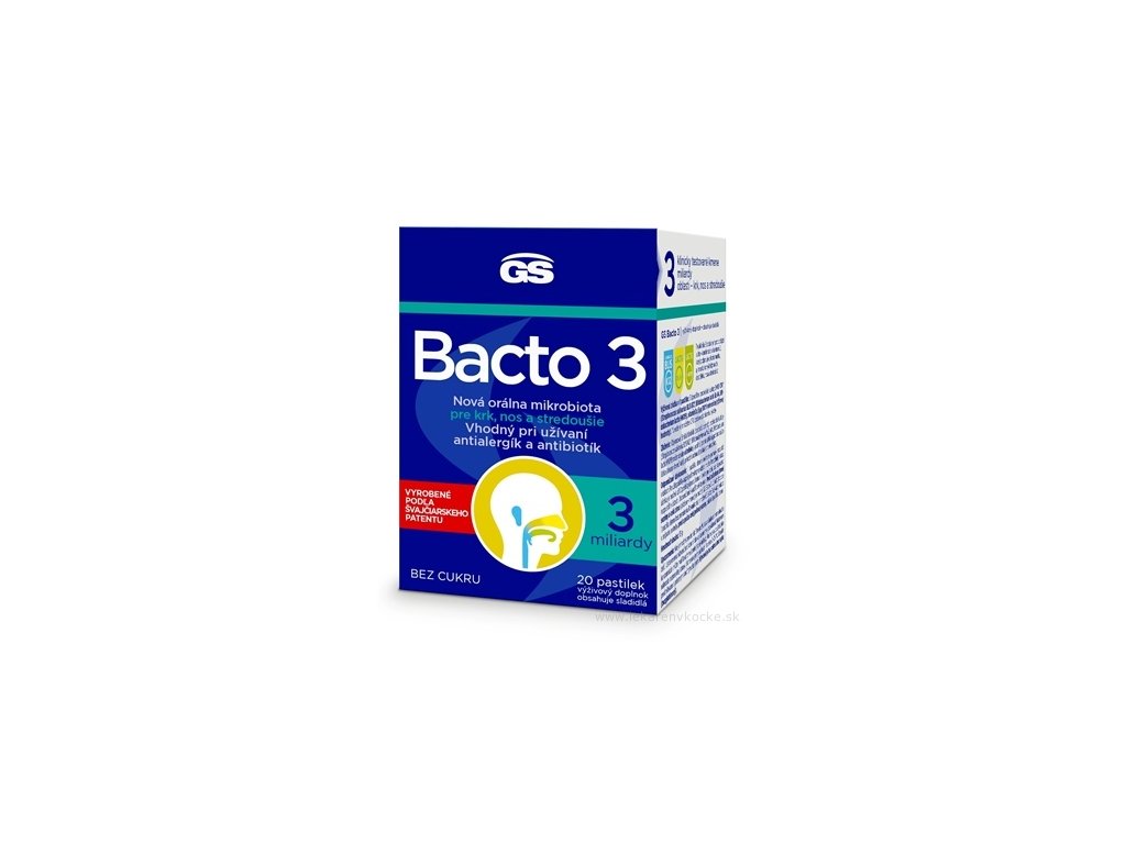 GS Bacto 3, probiotika na krk a nos, Streptococcus salivarius BLIS K12, Bifidobacterium lactis BL-04, vitamin D3, obnova mikroflóry, pastilky bez cukru, podpora imunity sliznic, doplněk stravy pro horní dýchací cesty, probiotika po antibiotikách