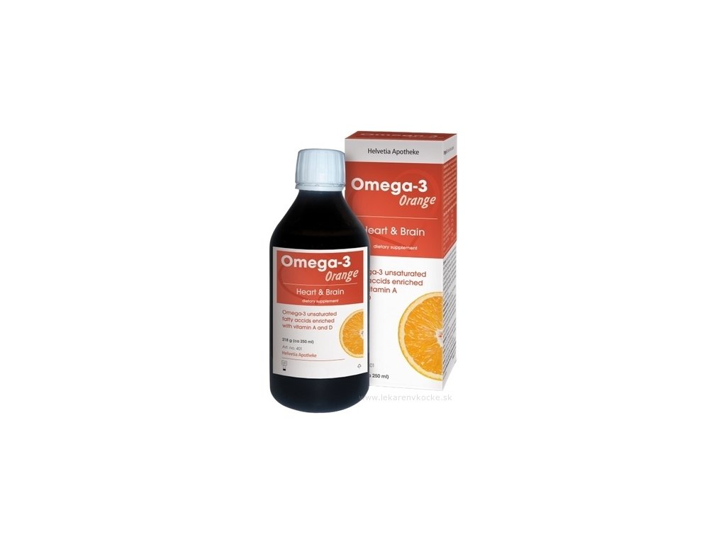 Helvetia Apotheke Omega-3 Orange je tekutý doplněk stravy s příjemnou pomerančovou příchutí, určený pro děti od 3 let i dospělé. Obsahuje koncentrovaný rybí olej bohatý na omega-3 mastné kyseliny (EPA a DHA), doplněný o vitamíny D a A. Tato kombinace přispívá ke správnému fungování srdce, mozku, zraku, imunity, kostí, svalů i zubů. Příjem alespoň 250 mg EPA a DHA denně pomáhá udržovat normální činnost srdce, zatímco vitamin D a A podporují obranyschopnost a zdraví zraku.