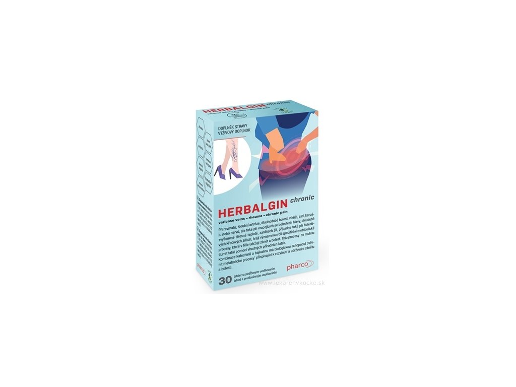 HERBALGIN chronic obsahuje originálně upravenou bylinnou směs šišáku a akácie, v tabletách s postupným uvolňováním. Je vhodný pro lidi s dlouhodobým zánětem v těle, revmatem, artrózou kloubů nebo karpálem, dlouhodobými bolestmi v kříži a zad, dlouhodobými bolestmi nebo zánětem nervů, dlouhodobým střevním zánětem, dlouhodobým zánětem průdušek (např. astma), hemeroidy, křečovými žilami nebo migrénou. Užívá se 1 tableta ráno a 1 tableta večer.