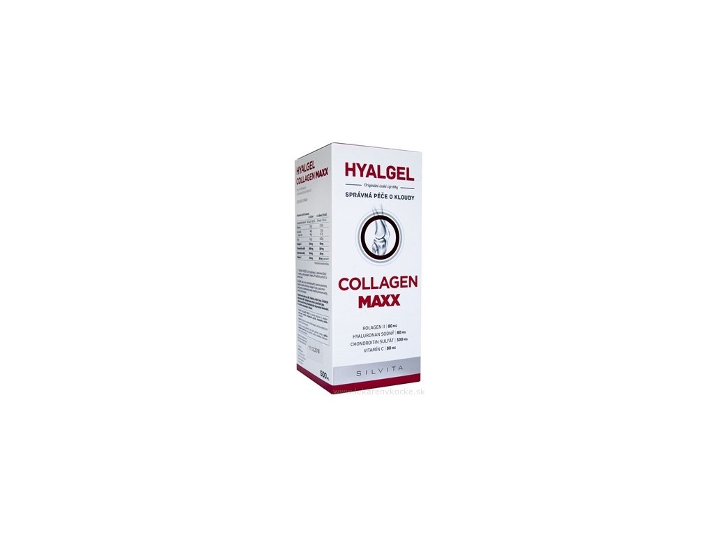 Doplněk stravy HYALGEL COLLAGEN MAXX obsahuje kolagen II, hyaluronan sodný, chondroitin sulfát a vitamin C.