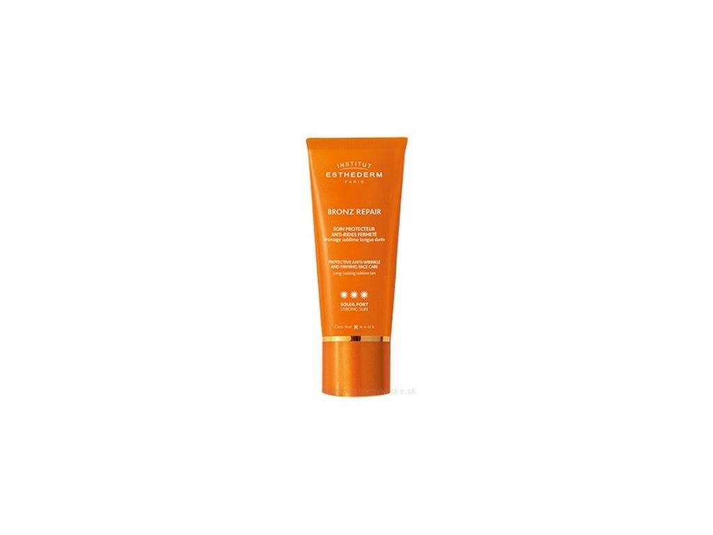 Esthederm Bronz Repair Strong Sun je vysoce kvalitní protivráskový opalovací krém určený na obličej, speciálně vyvinutý pro podmínky silného slunečního záření. Díky inovativním technologiím nejenže poskytuje vysokou ochranu před UV zářením, ale zároveň podporuje zdravé a jednotné opálení, chrání buněčné struktury a účinně bojuje proti předčasnému stárnutí pleti. Je ideální pro ty, kteří touží po bezpečném opálení bez rizika poškození pokožky a zároveň chtějí předcházet vzniku vrásek.