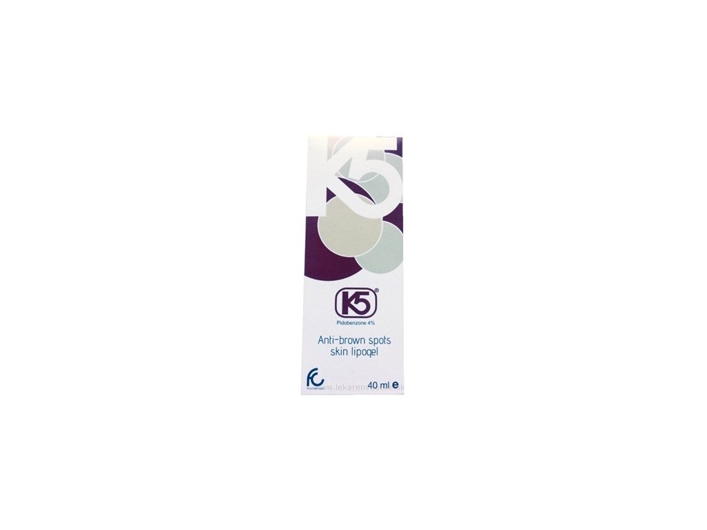 K5 lipogel je přípravek pro depigmentaci hnědých skvrn na kůži. Obsahuje Pidobenzon 4%.
