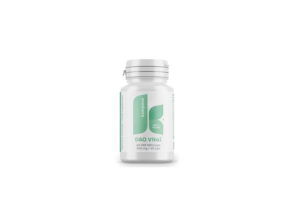 Kompava DAO Vital – výživový doplněk obsahující enzym diaminooxidázu (DAO), vitamin B6 a vitamin C, který podporuje metabolismus histaminu a přispívá ke zlepšení jeho odbourávání v organismu.