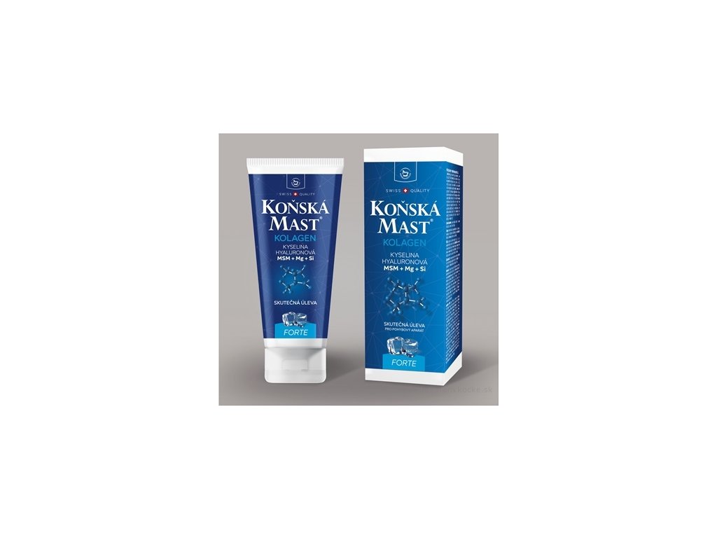 Koňská mast s mořským kolagenem forte chladiva je unikátní emulzní gel s mořským kolagenem, kyselinou hyaluronovou a 25 bylinnými a rostlinnými extrakty vyrobený na základě tradiční švýcarské receptury, obohacený o MSM, komplex hořčíku a bioaktivní křemík z extraktu přesličky. Emulzní gel při masáži rychle vyvolá intenzivní osvěžení.