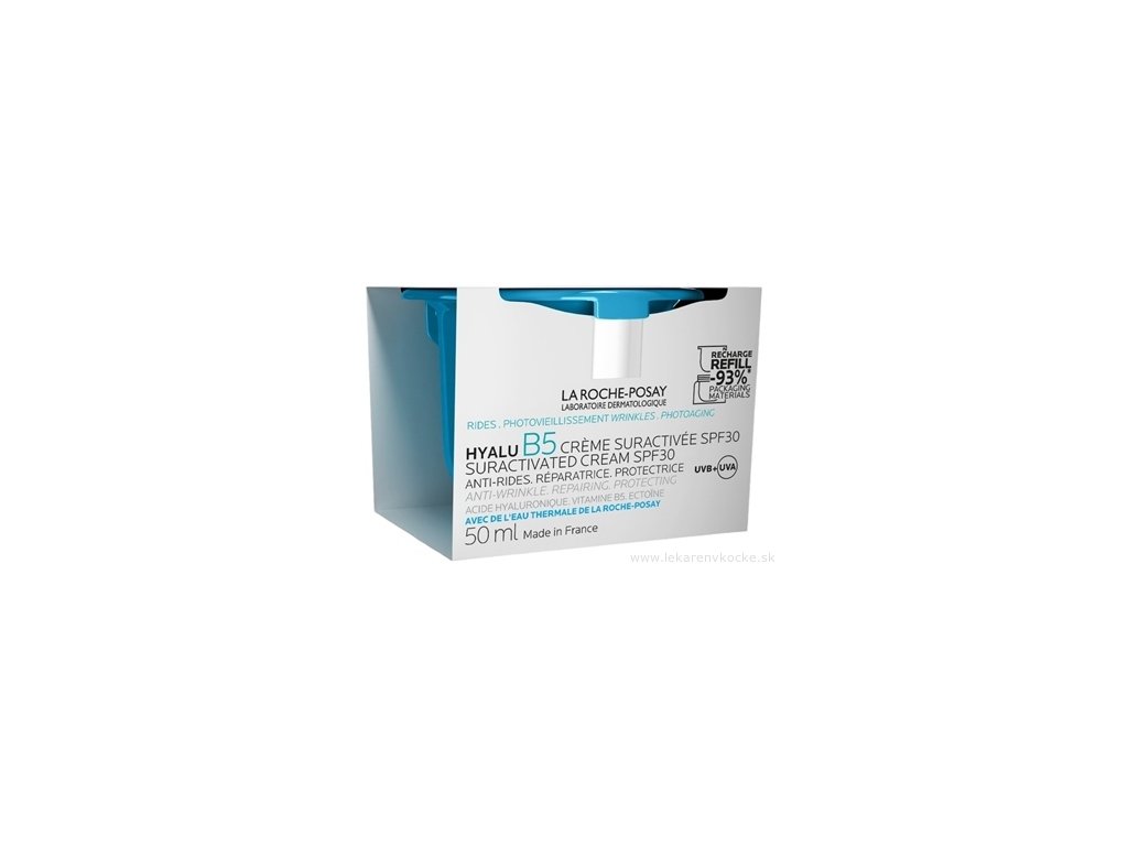 LA ROCHE-POSAY HYALU B5 CREME SURACTIVÉE SPF30 je ultra koncentrovaný krém proti vráskám určen pro všechny typy pleti, včetně citlivé. Jedná se o náhradní náplň 50 ml, která je navržena pro snadné doplnění původního skleněného balení. Krém spojuje anti-aging péče, intenzivní hydrataci a ochranu před slunečním zářením SPF30 v jednom kroku. Díky aktivním látkám cíleně působí proti viditelným projevům stárnutí pleti, jako jsou vrásky, ztráta pevnosti a elasticity.
