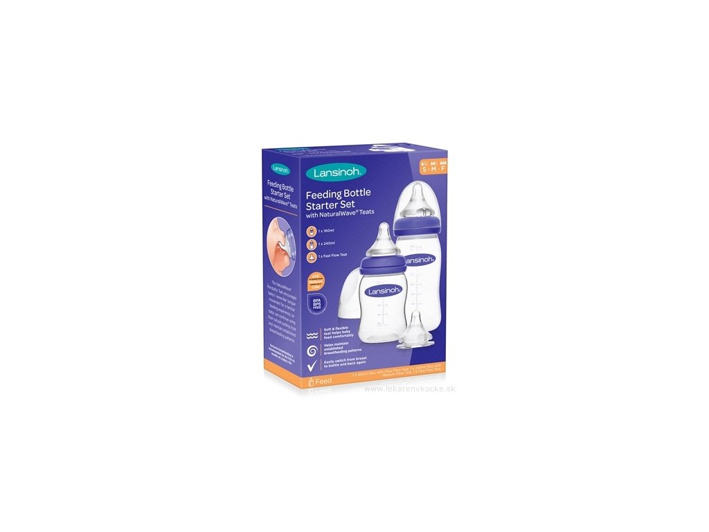 Lansinoh Startovací set kojeneckých lahví s NaturalWave® dudlíky je ideální balení přizpůsobené potřebám při krmení dítěte. Lansinoh NaturalWave® dudlík byl speciálně vyvinut pro kojené děti. Díky extra měkkému a pružnému silikonu se přizpůsobuje podnebí dítěte a umožňuje mu udržovat jeho přirozené sací pohyby. Usnadňuje střídání kojení z prsu s krmením z láhve a zpět.