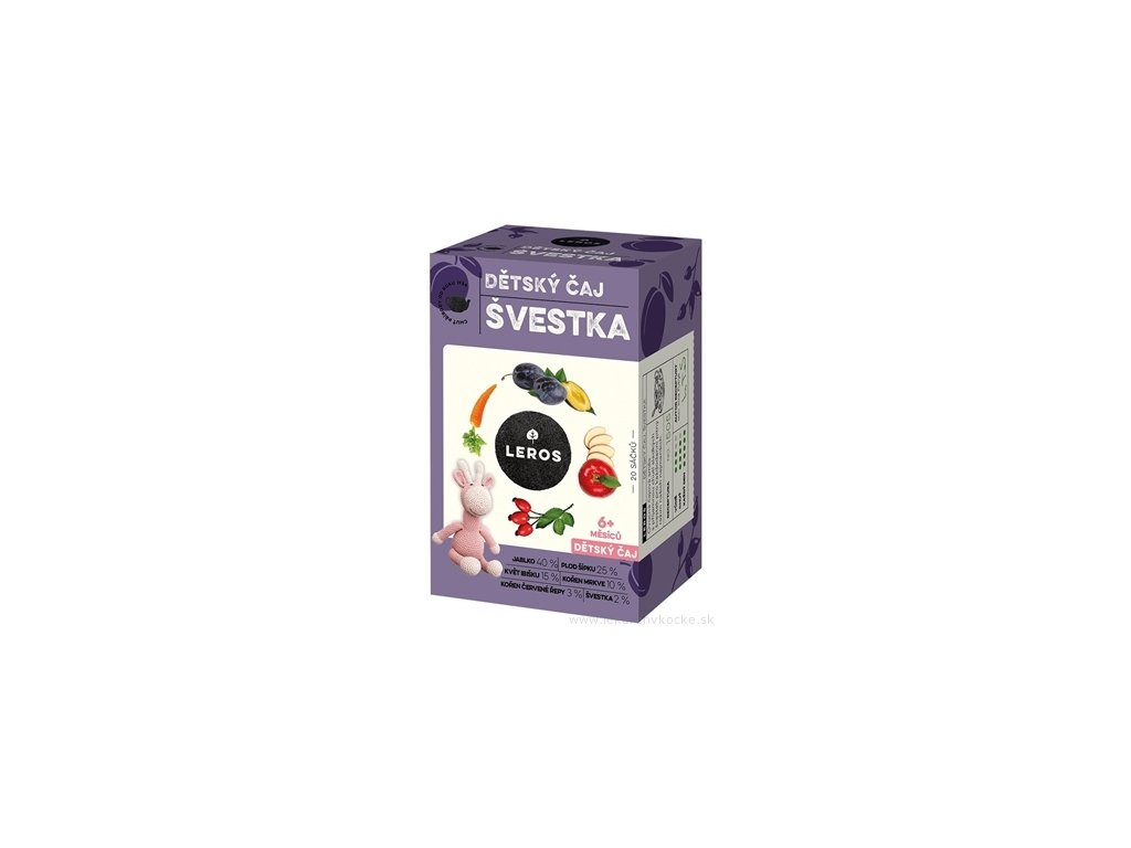 Leros Dětský čaj Švestka, ovocný čaj aromatizovaný s příchutí švestky, v čajových sáčcích. Vyvážená směs vysoce kvalitních bylin a plodů, šetrných k dětskému zažívání, vhodná k doplnění pitného režimu dětí i dospělých. Příjemnou chuť dotváří kořen mrkve a granulovaného plodu švestky v kombinaci se švestkovým aroma. V letních měsících doporučujeme čaj podávat vlažný nebo chlazený.