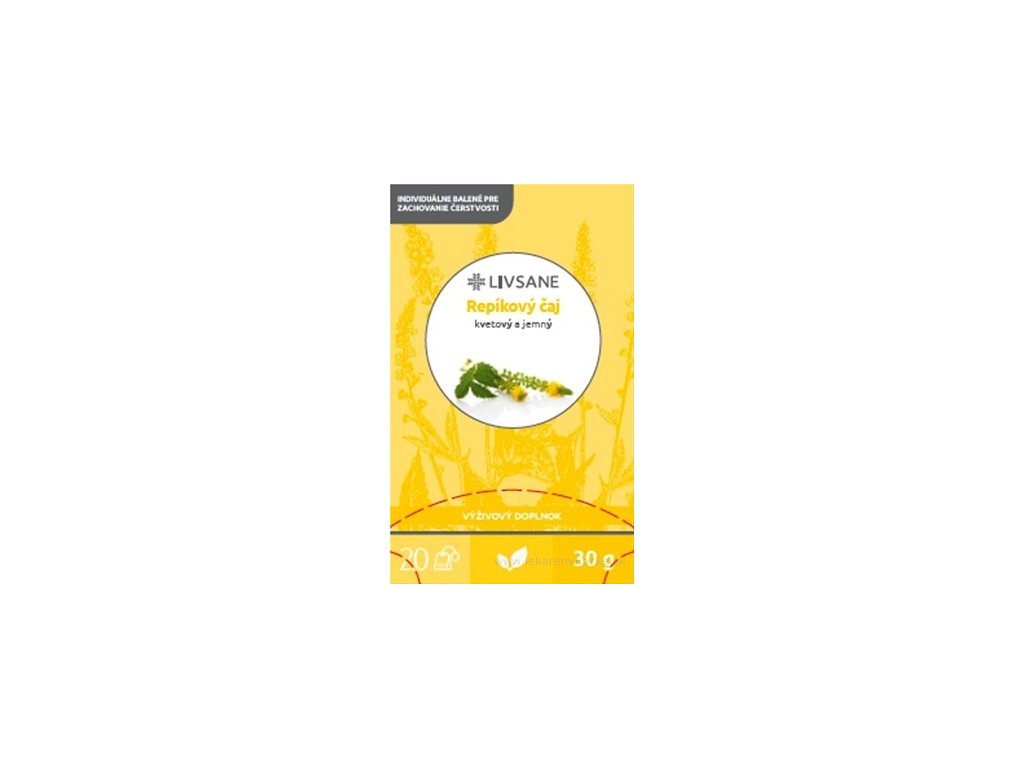 LIVSANE Řepíkový čaj je bylinný čaj, který využívá léčivých vlastností řepíku lékařského (Agrimonia eupatoria L.). Tento kvalitní čaj je plněn do dvoukomorových nálevových sáčků, každý sáček je individuálně balen, aby se zachovala čerstvost a účinnost čaje. Řepík je známý svými pozitivními účinky na trávicí systém a podporou zdraví jater.