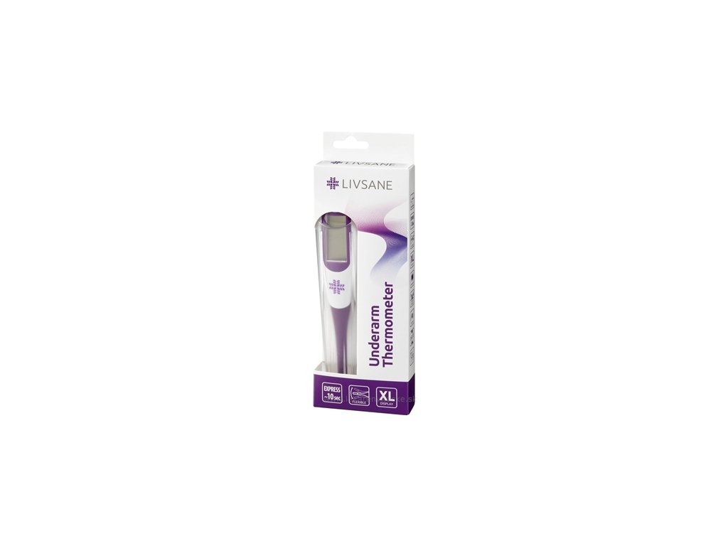 Teploměr pro rychlé měření tělesné teploty v podpaží. Balení zahrnuje teploměr, baterii a ochranný obal.