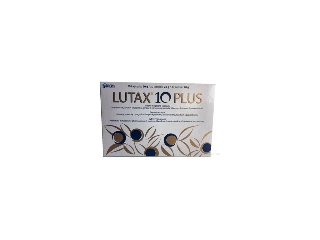 Lutax 10 Plus s vitamíny, minerálními látkami, omega-3 mastnými kyselinami, antokyanidiny, luteinem a zeaxantinem. Doplněk stravy Lutax 10 Plus byl speciálně navržen a vyroben, vycházející z vědeckých poznatků. Vitamin C, vitamin E, měď a zinek přispívají k ochraně buněk před oxidačním stresem. Omega-3 mastná kyselina - kyselina dokosahexaenová (DHA) a zinek přispívají k udržení dobrého zraku. Denní příjem 250 mg DHA má příznivý účinek na udržení dobrého zraku.