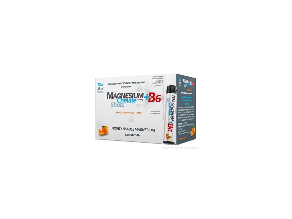 Doplněk stravy se sladidly a pomerančovou příchutí.Chelátová forma hořčíku. 1 ampule (25ml) obsahuje: Magnesium: 375 mg, Vitamin B6: 1,4 mg