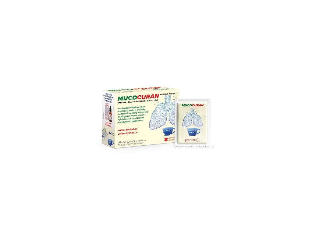 MUCOCURAN je výživový doplněk se sladildem. Vhodný pro lidi s krátkodobými nebo dlouhodobými obtížemi horních a dolních cest dýchacích. zahleněné průdušky. Obsahuje výtažek vasicin (molekulově podobný bromhexinu), palmitoyletanolamid, kvercetin, eukalyptus a mátu. Balení obsahuje 8 sáčků s práškem, který se rozmíchá ve vodě (max. 40 °C), doporučuje se užívat 1 sáček denně, ráno).