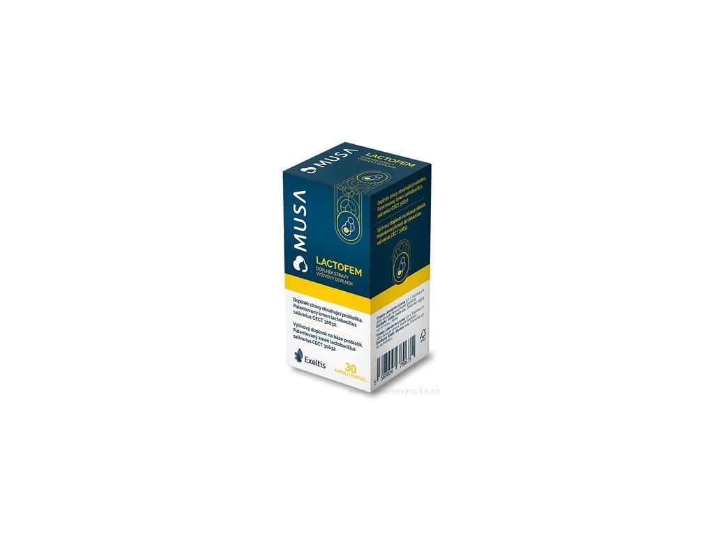 MUSA LACTOFEM je doplněk stravy určený pro ženy, které chtějí přirozeně podpořit své intimní zdraví a připravit svůj organismus na období těhotenství. Díky obsahu speciálního probiotického kmene Lactobacillus salivarius CECT 30632 v množství ≥ 1 miliarda CFU na kapsli, přispívá k rovnováze vaginální mikroflóry a tím pomáhá snižovat riziko vzniku nepříjemných infekcí.