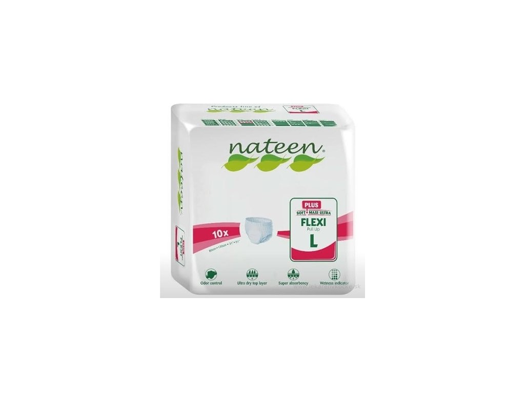Kalhotky plenkové nateen FLEXI PLUS L/XL natomicky tvarované, vhodné pro těžkou inkontinenci moči a stolice. Jsou určeny pro mobilní i imobilní pacienty. Zabezpečují pocit sucha, trojité absorbční jádro zvyšuje schopnost absorbovat tekutiny a zápach, jsou prodyšné, vyrobeny z netkané nealergenní textilie.