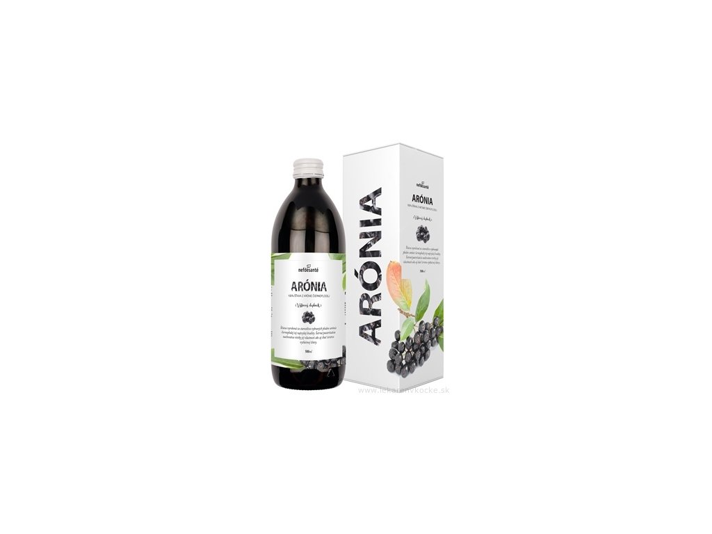 Doplněk stravy, 100% pasterizovaná šťáva vyrobená z pečlivě vybraných plodů aronie černoplodé (Aronia melanocarpa) s přídavkem vitamínu C. 500 ml láhev zabalené v krabičce.