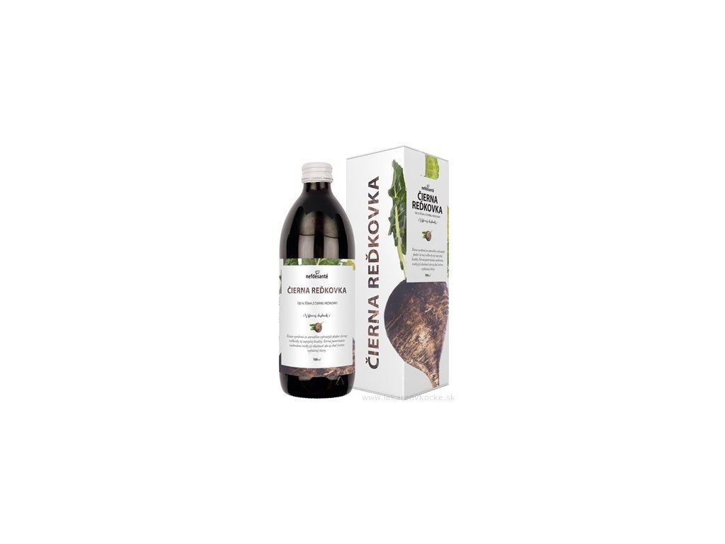 ČERNÁ ŘEDĚVKA, výživový doplněk. 100% pasterizovaná šťáva vyrobená z pečlivě vybraných plodů černé ředkvičky (Raphanus Sativus). Jedná se o 500 ml láhev 100% šťávy z plodů Černé ředkvičky s přídavkem vitamínu C zabalenou v krabičce.