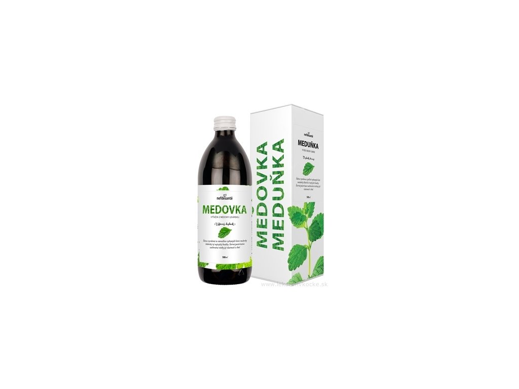 Doplněk stravy, výtažek z meduňky lékařské, pasterizovaná šťáva vyrobená z pečlivě vybraných listů meduňky lékařské (Melissa officinalis L.) 500 ml láhev zabalená v krabičce.